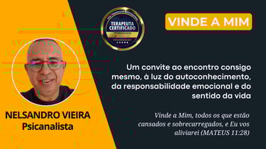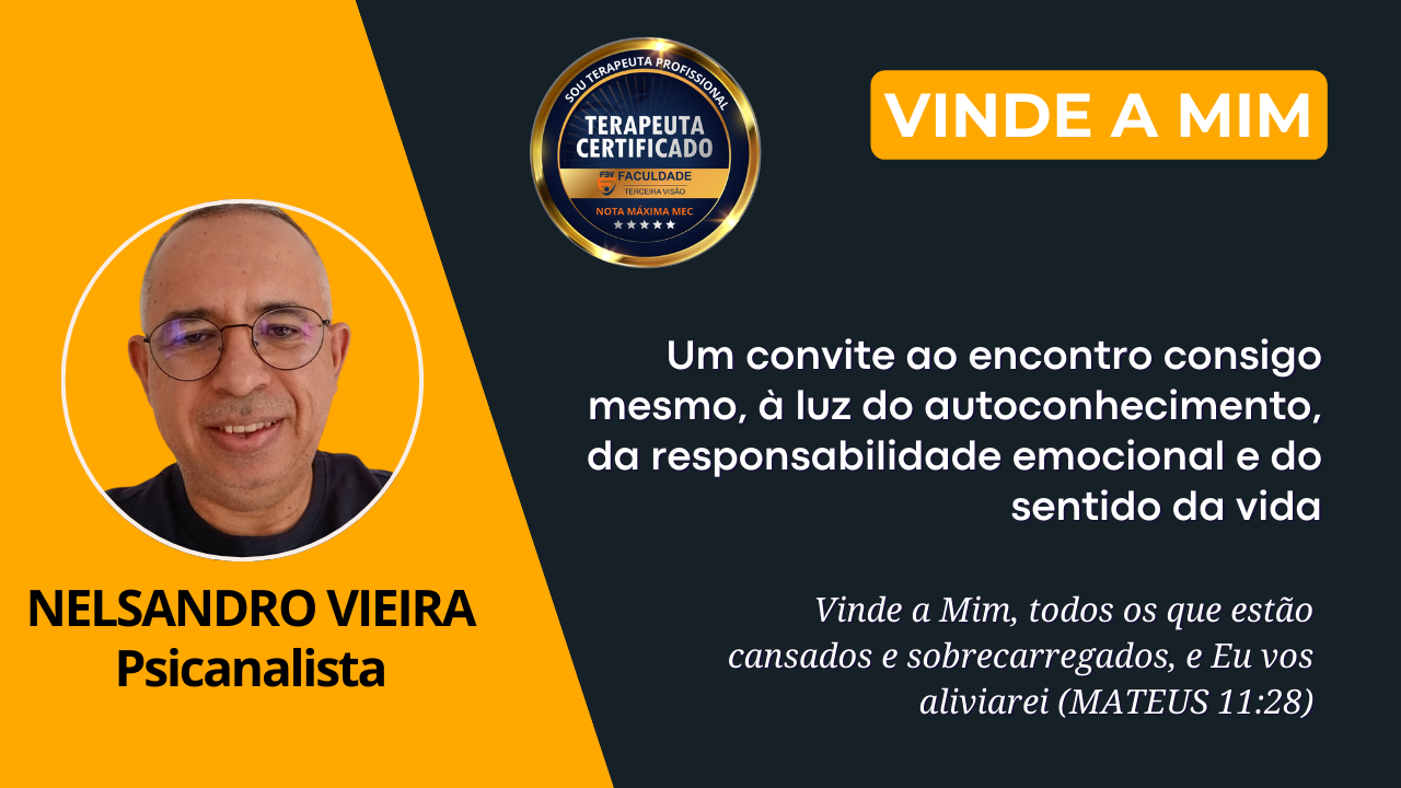 A JORNADA VINDE A MIM é organizado em 12 sessões sequenciais, conduzidas por Nelsandro Vieira (Psicanalista Clínico), em atendimento individualizado.