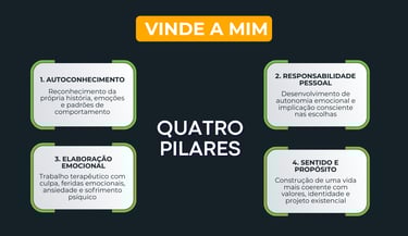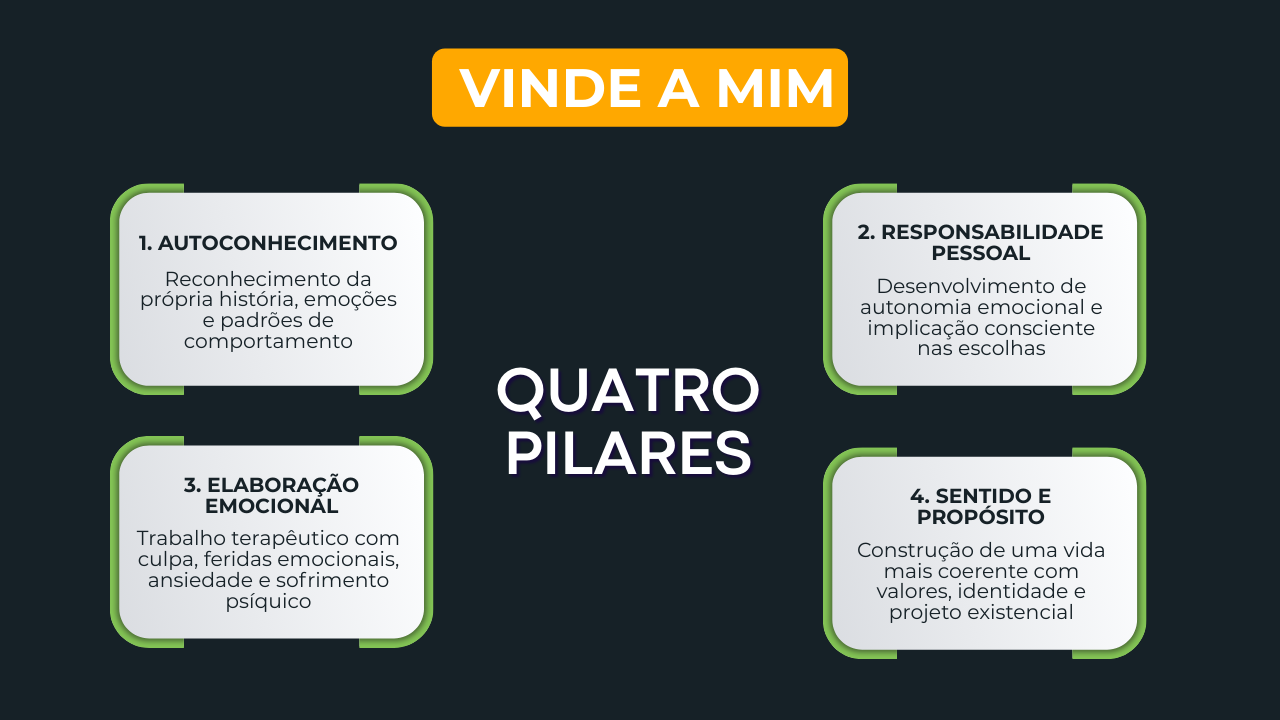 VINDE A MIM é uma JORNADA de autoconhecimento e autotransformação estruturada em 12 sessões, que integra fundamentos da Psicanálise com os ensinamentos de Jesus, apresentados de forma ética e responsável. Utiliza os valores e ensinamentos de Jesus como recursos simbólicos de reflexão, autoconhecimento e transformação interior.