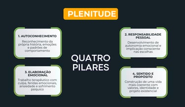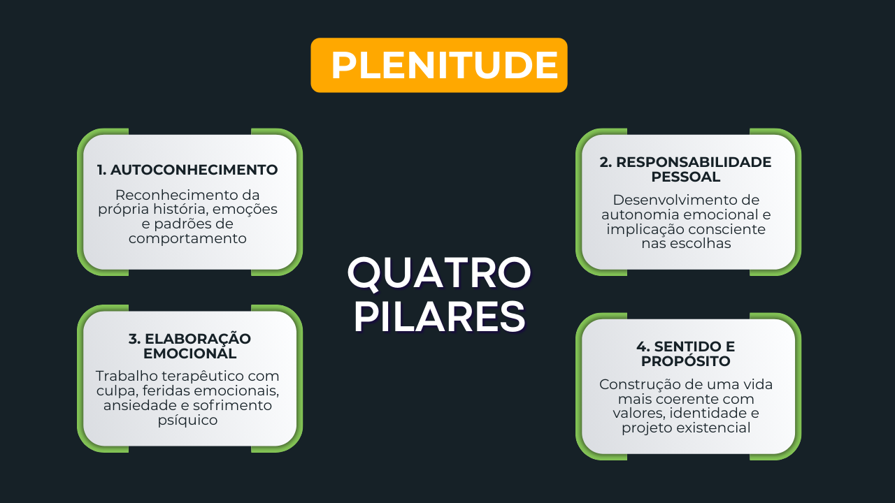 Plenitude é um programa de desenvolvimento pessoal estruturado em 12 sessões, que integra fundamentos da Psicanálise com os ensinamentos de Jesus, apresentados de forma ética e responsável. Utiliza os valores e ensinamentos de Jesus como recursos simbólicos de reflexão, autoconhecimento e transformação interior.